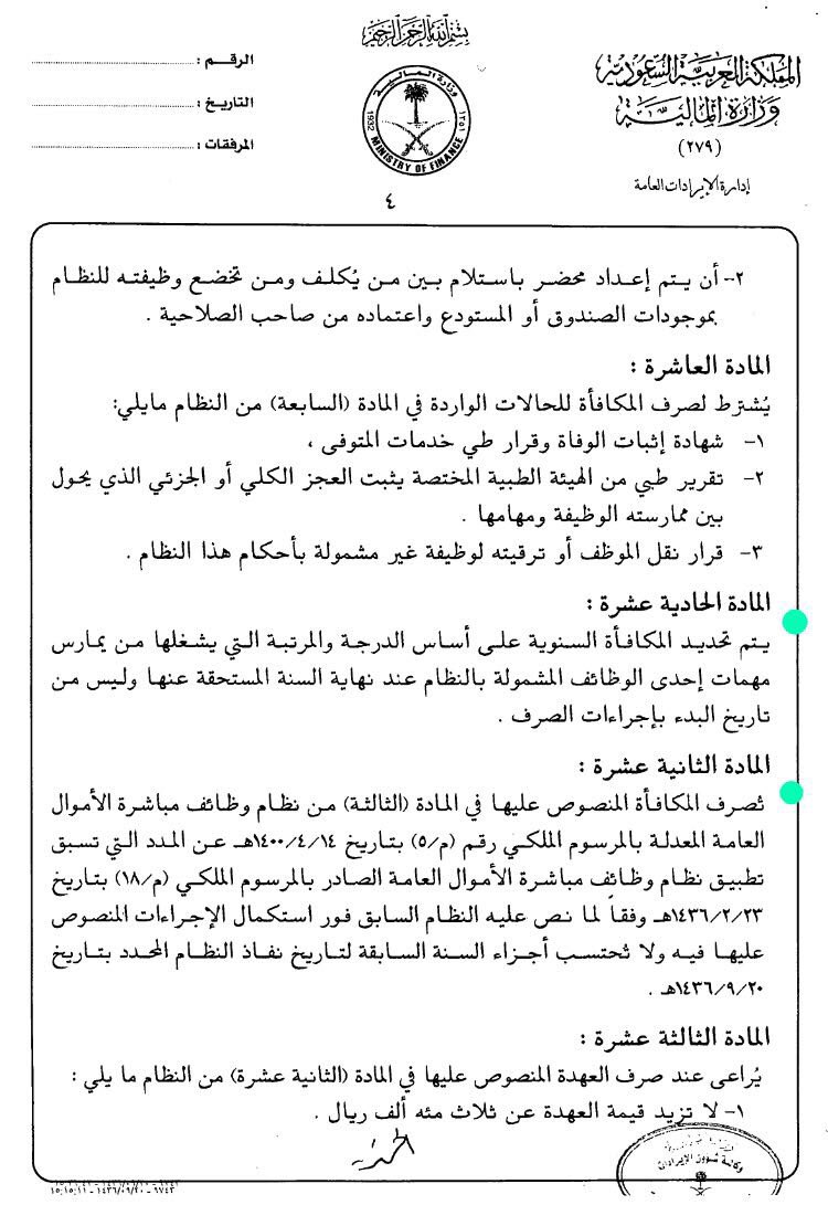 قـرار Qarar Pa Twitter مكافأة مباشرة الأموال العامة تصرف عن الفترة من بداية تطبيق النظام الجديد في 1436 9 20هـ بشكل سنوي بواقع راتب شهرين أساسيين لكل سنة كاملة مكافأة الفترة ما قبل هذا التاريخ