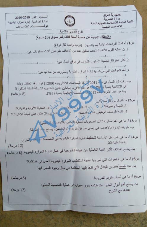 اسئلة ادارة المواد البشرية للصف السادس المهني الفرع التجاري الادارة 2020 مع الإجوبة