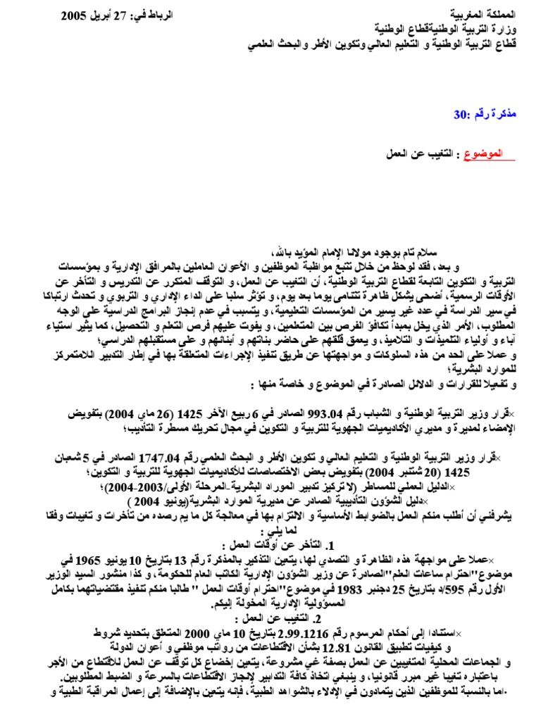 مذكرة رقم 30 في شأن التغيب عن العمل و مواظبة الموظفين و الأعوان العاملين بالمرافق الإدارية و بمؤسسات التربية و التكوين