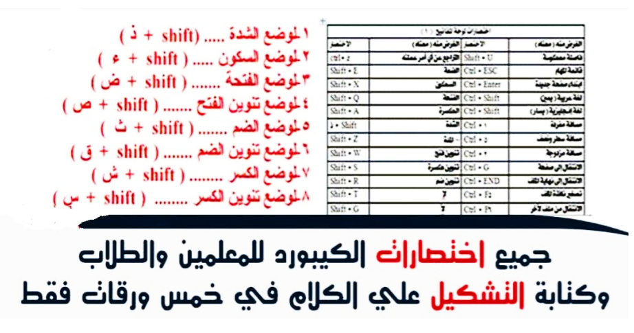 كل اختصارات الكيبورد لوحة المفاتيح وكتابة الحركات بالعربي وتشكيل الكلمات في خمس ورقات فقط