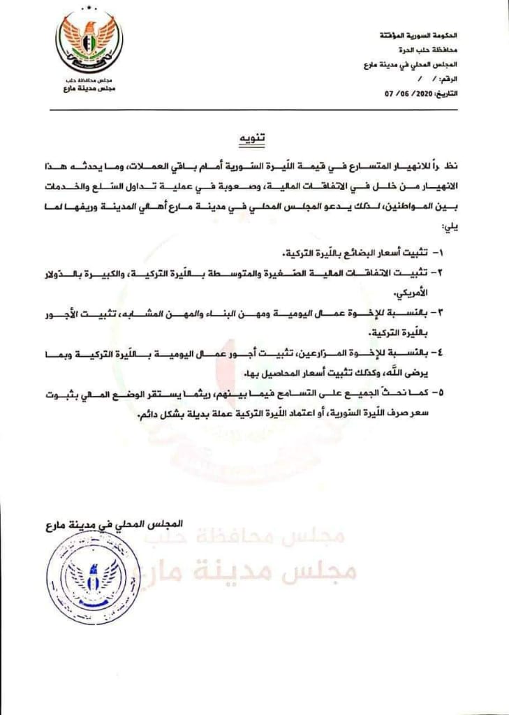 Elizabeth Tsurkov On Twitter The Mare Local Council Located In Northern Aleppo In An Area Under Turkish Control Issues A Decision To Move The Economy To The Turkish Lira And Dollar As