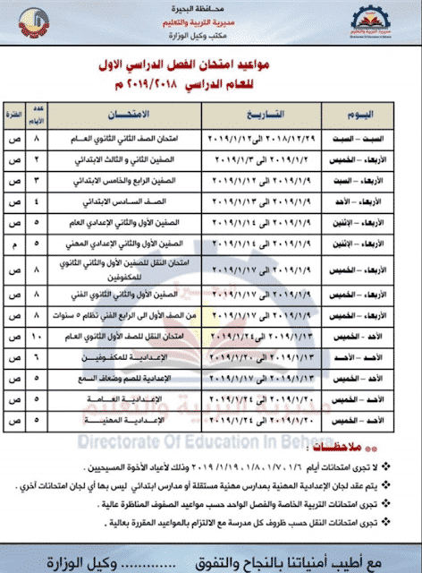 جدول امتحانات المرحلة الابتدائية الترم الاول 2019 جميع المحافظات