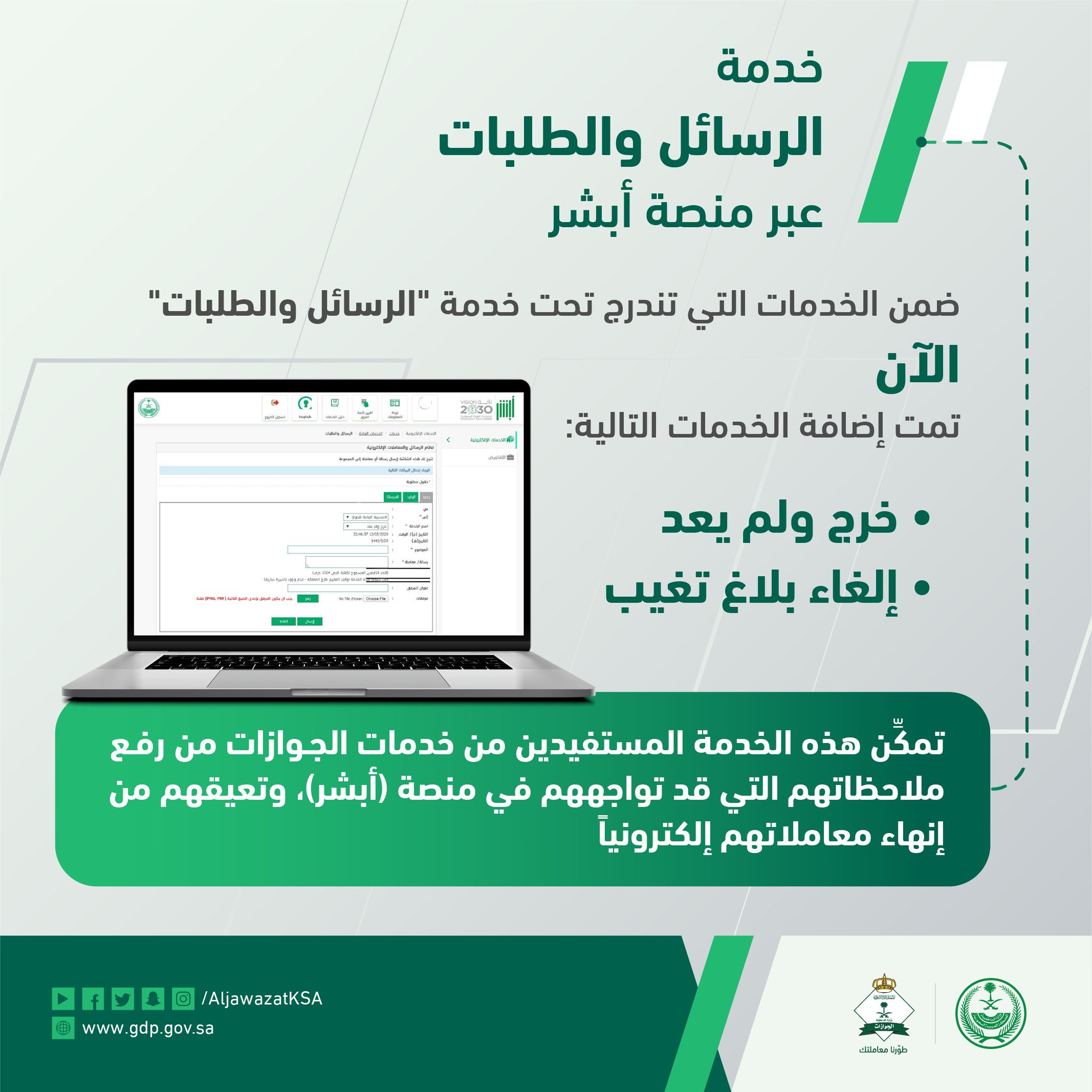 الجوازات السعودية On Twitter تحقيق ا للاستفادة القصوى من خدمات الجوازات المتاحة عبر منصة أبشر الجوازات تضيف حالتي خرج ولم يعد وإلغاء بلاغ التغيب لخدمة الرسائل والطلبات Https T Co 2srbmkub3z